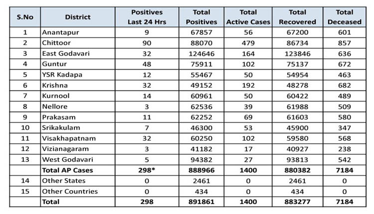 ఎపిలో కొత్తగా 298 కరోనా కేసులు