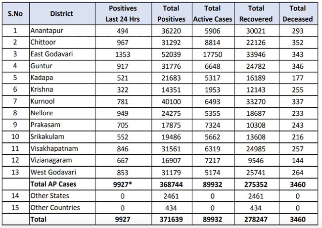 అమరావతి : ఎపిలో కరోనా వైరస్ వేగంగా వ్యాపిస్తోంది. గడిచిన 24 గంటల్లో కొత్తగా 9,927 కరోనా పాజిటివ్ కేసులు నమోదవ్వగా.. అదే సమయంలో 92 మరణాలు సంభవించాయి. ఇప్పటి వరకు రాష్ట్రంలో 3,71,639 కరోనా పాజిటివ్ కేసులు నమోదవ్వగా.. మొత్తం మరణాల సంఖ్య 3,460కి చేరుకుంది. ప్రస్తుతం 89,932 మంది కరోనా రోగులు వివిధ ఆస్పత్రుల్లో చికిత్స పొందుతుండగా.. 2,78,247 మంది కరోనా నుంచి కోలుకొని డిశ్చార్జ్ అయ్యారు. గడిచిన 24 గంటల్లో 9,419 మంది కరోనా నుంచి కోలుకొని డిశ్చార్జ్ అయ్యారు. ఇదే సమయంలో 64,351 మందికి కరోనా పరీక్షలు నిర్వహించారు. ఇప్పటి వరకు రాష్ట్రంలో 33,56,852 మందికి పరీక్షలు నిర్వహించారు. ఈ మేరకు రాష్ట్ర వైద్య, ఆరోగ్య శాఖ వివరాలను వెల్లడించింది.