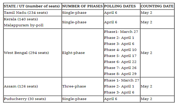 నాలుగు రాష్ర్టాలు, ఒక కేంద్ర పాలిత ప్రాంతానికి జరిగే ఈ ఎన్నికల పోలింగ్ ఫలితాలను మే 2వ తేదీన ప్రకటించనున్నట్లు సీఈసీ తెలిపారు.