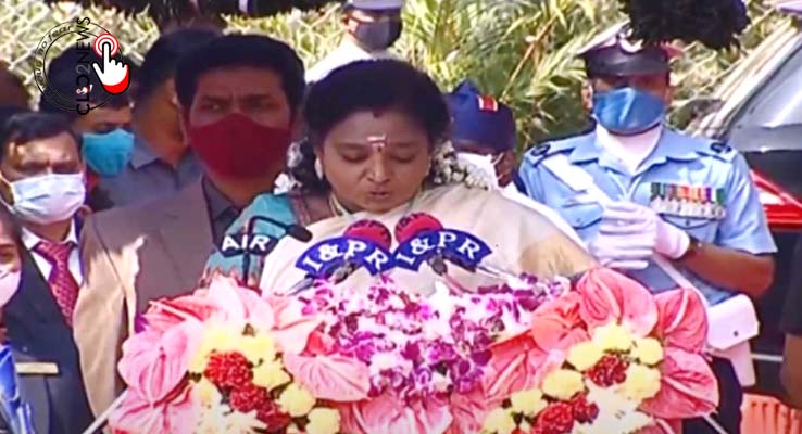 హైద‌రాబాద్ : 72వ గ‌ణ‌తంత్ర దినోత్స‌వ వేడుక‌లు మంగ‌ళ‌వారం న‌గ‌రంలోని నాంప‌ల్లి ప‌బ్లిక్ గార్డెన్‌లో ఘ‌నంగా జ‌రిగాయి. ఈ వేడుక‌ల్లో గ‌వ‌ర్న‌ర్ త‌మిళిసై సౌంద‌ర్ రాజ‌న్ జాతీయ జెండాను ఆవిష్క‌రించారు. అనంత‌రం పోలీసు గౌర‌వ వంద‌నాన్ని గ‌వ‌ర్న‌ర్ స్వీక‌రించారు. ఈ సంద‌ర్భంగా రాష్ర్ట ప్ర‌జ‌ల‌కు గ‌వ‌ర్న‌ర్ త‌మిళిసై గ‌ణ‌తంత్ర దినోత్స‌వ శుభాకాంక్ష‌లు తెలిపారు. ఈ సంద‌ర్భంగా గ‌వ‌ర్న‌ర్ మాట్లాడుతూ.. “తెలంగాణ మిగ‌తా రాష్ట్రాల‌కు మార్గ‌ద‌ర్శ‌కంగా నిలుస్తోంది. క‌రోనాను రాష్ట్ర ప్ర‌భుత్వం ధీటుగా ఎద‌ర్కొంది“ అని అన్నారు. భార‌త్ బ‌యోటెక్ తొలి దేశీయ టీకాను రూపొందించిందని పేర్కొన్నారు. ప‌ల్లె ప్ర‌గ‌తి ద్వారా గ్రామాల్లో మౌలిక స‌దుపాయాలు క‌ల్పించామ‌న్నారు. ప‌ల్లె ప్ర‌గ‌తి ప‌థ‌కం దేశానికి ఆద‌ర్శంగా నిలిచింద‌ని తెలిపారు. హ‌రిత‌హారంలో నాటిన మొక్క‌ల్లో 91 శాతం సంర‌క్షించామ‌ని చెప్పారు. 12 వేల‌కు పైగా డంపింగ్ యార్డులు ఏర్పాటు చేస్తున్నామ‌ని గుర్తు చేశారు. ప్ర‌తి గ్రామంలో వైకుంఠ‌ధామం ఏర్పాటు చేస్తున్నామ‌ని తెలిపారు. స్వేదేశీ కొవిడ్ వ్యాక్సిన్‌తో ముందుకెళ్తున్నామన్నారు. ఫ్రంట్ లైన్ వారియ‌ర్స్‌కు హృద‌య‌పూర్వ‌క ధ‌న్య‌వాదాలు అని తెలిపారు. అలాగే ప‌ట్ట‌ణాల్లో మౌలిక సౌక‌ర్యాల కోసం ఏటా రూ. 148 కోట్లు ఖ‌ర్చు చేస్తున్నామ‌ని చెప్పారు. రాష్ర్టంలోని ప‌ట్ట‌ణాల్లో 2,802 పారిశుద్ధ్య వాహ‌నాలు ఏర్పాటు చేస్తున్నామ‌ని పేర్కొన్నారు. ఈ గ‌ణ‌తంత్ర దినోత్స‌వ వేడుక‌ల్లో ముఖ్య‌మంత్రి క‌ల్వ‌కుంట్ల చంద్ర‌శేఖ‌ర్‌రావు, ప‌లువురు మంత్రులు, ఎంపీలు, ఎమ్మెల్యేలు, ఎమ్మెల్సీలు పాల్గొన్నారు.