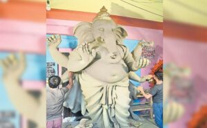 ఖైరతాబాద్: తెలుగు రాష్ట్రాల్లో ఖైరతాబాద్ గణనాథుడికి ప్రత్యేక స్థానం.. వినాయక చవితి వచ్చిందంటే చాలు తెలుగు ప్రజలంతా ఖైరతాబాద్ భారీ వినాయకుని గురించే మాట్లాడుకుంటారు. కానీ దానికి భిన్నంగా కోవిడ్ నేపథ్యంలో ఈ యేడాది ఖైరతాబాద్లో ఏర్పాటు చేసే గణనాథుడిని కేవలం తొమ్మిది అడుగులేక పరిమితం చేశారు. వ్యాధులను నయం చేసే ధన్వంతరి అవతారంలో ఈసారి గణనాథుడు భక్తులకు దర్శనమివ్వనున్నట్లు కమిటీ సభ్యులు తెలిపారు. ప్రపంచవ్యాప్తంగా కరోనా వైరస్ విజంభణను ఎదుర్కోవడంలో సాయం చేస్తాడనే విశ్వాసంతో ఈ ఏడాది స్వామివారిని ధన్వంతరి గణపతిగా రూపొందిస్తున్నట్లు కమిటీ సభ్యులు పేర్కొన్నారు. గణేశ్ విగ్రహాన్ని ఈసారి పూర్తిగా ఎకో ఫ్రెండ్లీగా మట్టితో తయారు చేస్తున్నారు. వినాయకుడి తయారీ తుది దశకు చేరుకున్నట్లు వారు తెలిపారు. వినాయకుడికి ఒకవైపు లక్ష్మీదేవి, మరోవైపు సరస్వతీదేవి విగ్రహాలను కూడా మట్టితోనే తయారు చేస్తున్నామన్నారు.