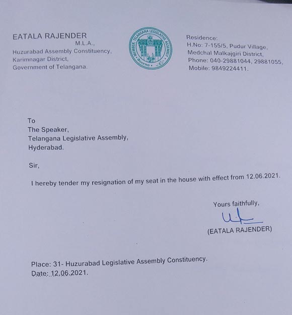 శాస‌న స‌భ స‌భ్యాత్వానికి ఈట‌ల రాజీనామా