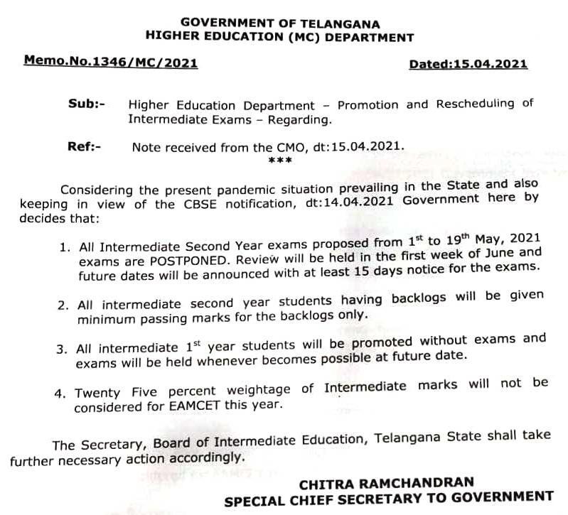 అటు ఇంటర్ సెకండియర్‌లో బ్యాక్‌లాగ్స్ ఉన్న విద్యార్ధులకు మినిమమ్ పాస్ మార్కులు ఇవ్వనున్నట్లు ప్రకటించింది. అలాగే ఈ ఇయర్ ఎంసెట్‌లో 25 శాతం ఫస్టియర్ ఇంటర్మీడియట్ మార్కులకు సంబంధించిన వెయిటేజీ ఉందని ప్రభుత్వం వెల్లడించింది. అటు ఇంటర్ ప్రాక్టికల్స్‌ మే 29 నుంచి జూన్ 7 వరకు ఉంటాయని ఇప్పటికే ఇంటర్ బోర్డు ప్రకటించింది.