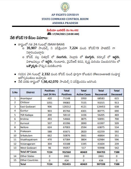 అమరావతి: ఆంధ్రప్రదేశ్లో కరోనా కేసులు రోజుకు వేయికి పైగా పెరుగుతున్నాయి. గత 24 గంటల వ్యవధిలో 35,907 సాంపిల్స్ ని పరీక్షించగా 7,224 మందికి కరోనా పాజిటివ్ నిర్ధారణ అయింది. ఈ మేరకు రాష్ట్ర వైద్య ఆరోగ్యశాఖ శనివారం కరోనా బులిటెన్ విడుదల చేసింది. తాజా కేసులతో కలిపి రాష్ట్రంలో కరోనా పాజిటివ్ కేసుల సంఖ్య రాష్ట్రంలో 955455 కు చేరుకొంది. గడిచిన 24 గంటల్లో కొవిడ్ కారణంగా 15 మంది మృతిచెందారు. తాజా మరణాలతో కలిపి రాష్ట్రంలో మొత్తం 7388 మంది కోవిడ్తో మృతిచెందారు.