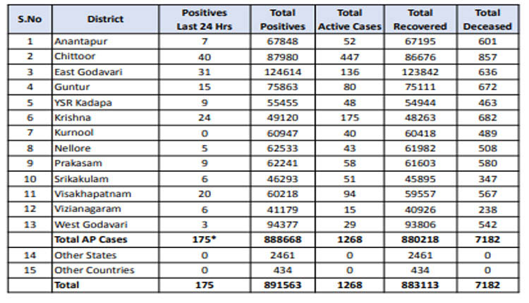అమరావతి: ఎపిలో గడిచిన 24 గంటల వ్యవధిలో కొత్తగా 175 కరోనా పాజిటివ్గా నిర్ధారణ అయ్యాయి. ఈ మేరకు రాష్ట్ర వైద్య ఆరోగ్యశాఖ శనివారం బులిటెన్ విడుదల చేసింది. రాష్ట్రంలో కరోనాతో కొత్తగా అనంతపూర్ ఒకరు, చిత్తూర్లో ఒకరు మరణించారు. తాజా మరణాలతో కలిపి కరోనా బారినపడి మరణించిన వారి సంఖ్య 7182కు చేరింది. తాజా కేసులతో కలిపి రాష్ట్రంలో నమోదైన మొత్తం పాజిటివ్ కేసుల సంఖ్య 891563కు చేరింది. ప్రస్తుతం రాష్ట్రంలో 1268 యాక్టివ్ కేసులున్నాయి. ఇప్పటి వరకు 883113 మంది కొవిడ్ నుంచి కోలుకున్నారని అధికారులు పేర్కొన్నారు.