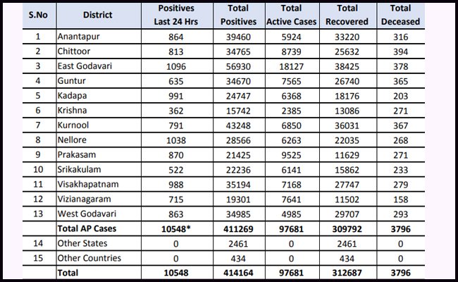అమరావతి : ఏపిలో కోరోనా జోరు కొనసాగుతోంది. గత 24 గంటల్లో 62,024 మందికి కరోనా వైరస్ పరీక్షలు చేయగా 10,548 మందికి పాజిటివ్ నిర్ధారణ అయినట్లు అధికారులు తెలిపారు. దీంతో మొత్తం కేసుల సంఖ్య 4,14,164కు చేరింది. ఈ మేరకు వైద్య ఆరోగ్య శాఖ శనివారం కరోనాపై హెల్త్ బులిటెన్ విడుదల చేసింది. కరోనా నుంచి కోలుకుని నిన్న ఒక్కరోజే 8,976 మంది డిశ్చార్జ్ అవ్వగా, ఇప్పటివరకూ మొత్తం 3,12,687 మంది డిశ్చార్జ్ అయ్యారు. రాష్ట్ర వ్యాప్తంగా గడిచిన 24 గంటల్లో కరోనా బారిన పడి 82 మంది మృతి చెందారు. ప్రస్తుతం రాష్ట్రంలో 97,681 యాక్టివ్ కేసులు ఉన్నాయి. ఇప్పటివరకూ 36,03,345 మందికి కరోనా పరీక్షలు చేశారు.