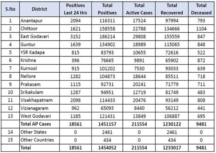 గ‌డిచిన 24 గంట‌ల్లో 109 మంది మృతిచెందారు. కోవిడ్‌తో ఇప్ప‌టి వ‌ర‌కు రాష్ట్రంలో 9481 మంది మరణించారు. కొత్త‌గా రాష్ట్రంలో 17,334 మంది కోలుకున్న‌ట్టు బులెటిన్‌లో పేర్కొంది. ఇప్ప‌టి వ‌ర‌కు కోలుకున్న‌వారి సంఖ్య 12,33,017కి పెరిగింది. ప్రస్తుతం రాష్ట్రంలో యాక్టివ్ కేసులు 2,11,554 మంది ఉన్నారు.