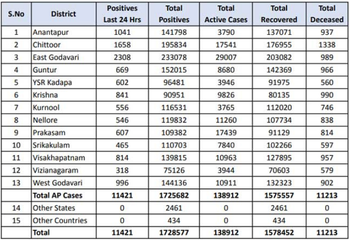 అమరావతి (CLiC2NEWS): ఆంధ్రప్రదేశ్ లో కరోనా కేసులు స్వల్పంగా తగ్గు ముఖం పట్టాయి. గడిచిన 24 గంటల వ్యవధిలో రాష్ట్రంలో కొత్తగా 11,421 కరోనా కేసులు నమోదయ్యాయి. ఈ మేరకు గురువారం సాయంత్రం రాష్ట్ర వైద్య ఆరోగ్యశాఖ కరోనా బులిటెన్ విడుదల చేసింది. ఇప్పటి వరకు రాష్ట్రంలో నమోదైన మొత్తం కరోనా కేసుల సంఖ్య 17,25,682 కు చేరింది.