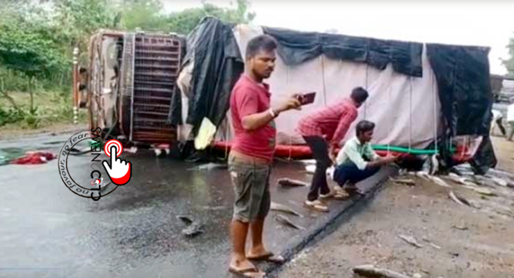 బూర్గంపాడులో చేపల లారీ బోల్తా.. 30 నిమిషాల్లో లోడు ఖాళీ..
