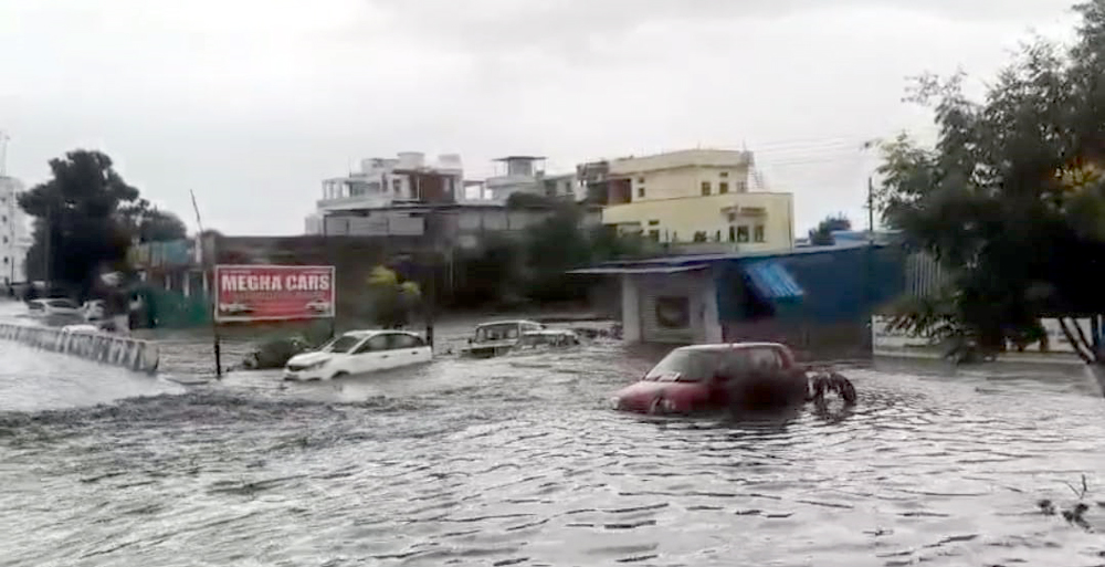 కామారెడ్డి లో గురువు రాఘవేంద్ర కాలనీలో మొదటి అంతస్తు వరకు కొన్ని ఇళ్లు వరద ప్రవాహంలో చెక్కుకున్నాయి.