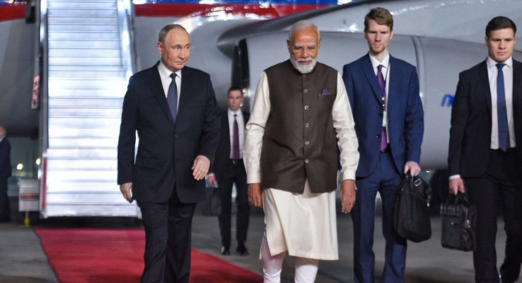 న్యూఢిల్లీ (): రెండు రోజుల భారత్ పర్యటనలో భాగంగా గురువారం సాయంత్రం న్యూఢిల్లీలోని పాలం విమానాశ్రయానికి రష్యా అధ్యక్షుడు పుతిన్ చేరుకున్నారు. ఈ సందర్భంగా ప్రధాన మంత్రి నరేంద్ర మోడీ స్వయంగా విమానాశ్రయానికి వెళ్లి పుతిన్ను సాదరంగా ఆహ్వానించారు. విమానాశ్రయం నుంచి పుతిన్, మోడీ ఒకే కారులో ప్రధాని అధికారిక నివాసానికి వెళ్లారు.