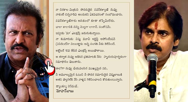 ‘‘నా చిరకాల మిత్రుని సోదరుడైన పవన్కల్యాణ్ నువ్వు నాకంటే చిన్నవాడివి అందుకని ఏకవచనంతో సంభోదించాను. పవన్కల్యాణ్ గారు అనడంలో కూడా తప్పేమీలేదు. చాలా కాలానికి నన్ను మెల్లగా లాగావ్. సంతోషమే. ఇప్పుడు `మా` ఎలక్షన్స్ జరుగుతున్నాయి. నా కుమారుడు విష్ణు మూవీ ఆర్టిస్ట్స్ అసోసియేషన్ ప్రెసిడెంట్గా నిలబడ్డాడన్న సంగతి మీకు తెలిసిందే. అక్టోబరు 10వ తేదీన ఎలక్షన్స్ అయిపోతాయి. ఆ తర్వాత నువ్వు అడిగిన ప్రతి మాటకీ నేను హృదయపూర్వకంగా సమాధానం చెబుతాను. ఈలోగా నువ్వు చేయవలసిన ముఖ్యమైన పని.. నీ అమూల్యమైన ఓటును నీ సోదర సమానుడైన విష్ణుబాబుకి, అతని ప్యానల్కి వేసి వాళ్ళ ని గెలిపించాలని కోరుకుంటున్నా.“