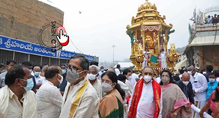 తిరుమల(CLiC2NEWS): తిరుపతిలో వైకుంఠ ఏకాదశి సందర్భంగా శ్రీవారి రథోత్సవం వైభవంగా నిర్వహించారు. శ్రీదేవి, భూదేవి సమేత మలయప్ఫ స్వామివారు బంగారు రథంపై తిరువీధుల్లో భక్తులకు దర్శనమిచ్చారు. వైకుంఠ ఏకాదశి పర్వదినం పురస్కరించుకొని పలు ప్రముఖుల ఈరోజు స్వామివారిని దర్శించుకున్నారు. సుప్రీంకోర్టు ప్రధాన న్యాయమూర్తి జస్టిస్ ఎన్వి రమణ దంపతులు శ్రీవేంకటేశ్వర స్వామి వారి సన్నిధిలో స్వర్ణ రథోత్సవం లో పాల్గొన్నారు.