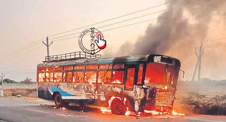 బస్సును ఢీకొన్న బైక్.. బస్సుపూర్తిగా దగ్ధం