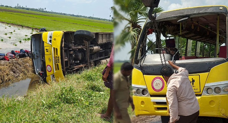 బాపట్ల జిల్లాలో స్కూల్ బస్సు బోల్తా.. 9 మంది విద్యార్థులకు గాయాలు