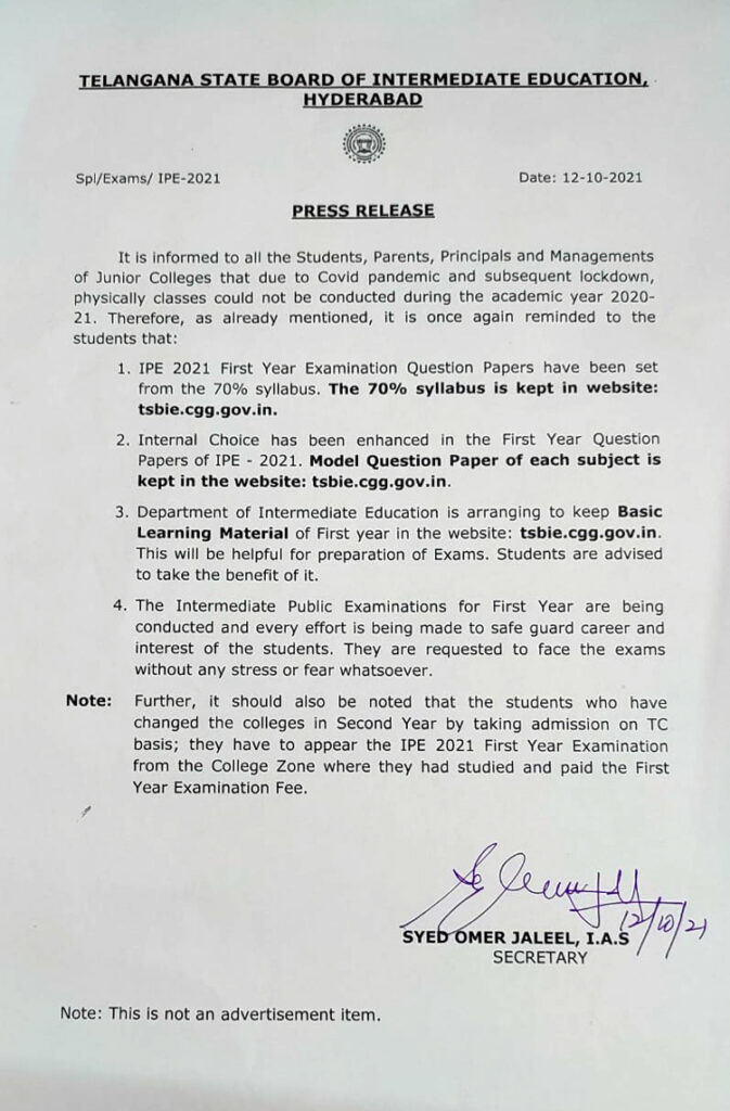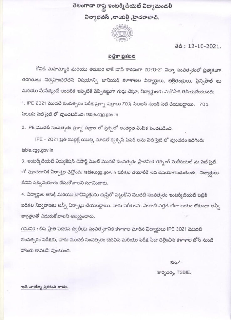TS: ఈ ఏడాది 70% సిలబస్తోనే ఇంటర్ పరీక్షలు