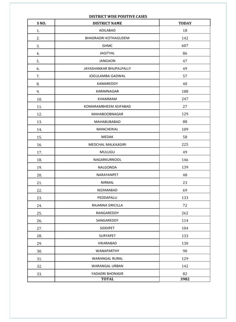 జీహెచ్ఎంసీ పరిధిలో 607 పాజిటివ్ కేసులు నమోదు కాగా, రంగారెడ్డి 262, ఖమ్మం 247, మేడ్చల్ జిల్లాలో 225 కేసులు నమోదు అయ్యాయి.