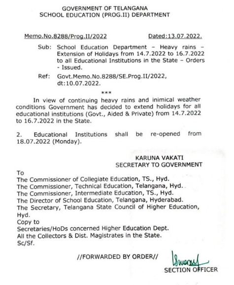 హైదరాబాద్ (CLiC2NEWS): తెలంగాణ వ్యాప్తంగా కుండపోత వర్షాలు కురుస్తోన్న సంగతి తెలిసిందే. ఈ నేపథ్యంలో తెలంగాణలోని విద్యా సంస్థలకు మరో మూడురోజుల పాటు సెలవులను సర్కారు పొడిగించింది. ఈ మేరకు రాష్ట్ర సర్కార్ ఉత్తర్వులను జారీ చేసింది గత సోమవారం మూడు రోజుల పాటు (నేటి వరకు) సెలవులు ప్రకటించిన విషయం తెలిసిందే. అయితే గత కొన్ని రోజులుగా రాష్ట్ర వ్యాప్తంగా విస్తారంగా వర్షాలు కురుస్తుండటం.. పలు చోట్ల వరద పరిస్థితులు ఉండటంతో మరో మూడు రోజులు సెలవులు పొడిగించాలని ప్రభుత్వం నిర్ణయించింది.